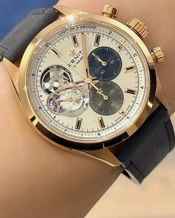 ケースバックはスケルトン仕様となっており、本格的な機械のパワーが備わったエル・プリメロの内部構造を楽しんでいただけます。