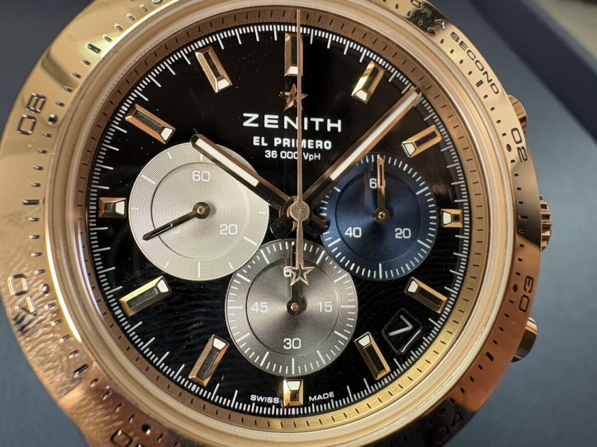 漆黒のブラックダイヤルに、ゼニス特有の3色クロノグラフダイヤルが美しく映えています。