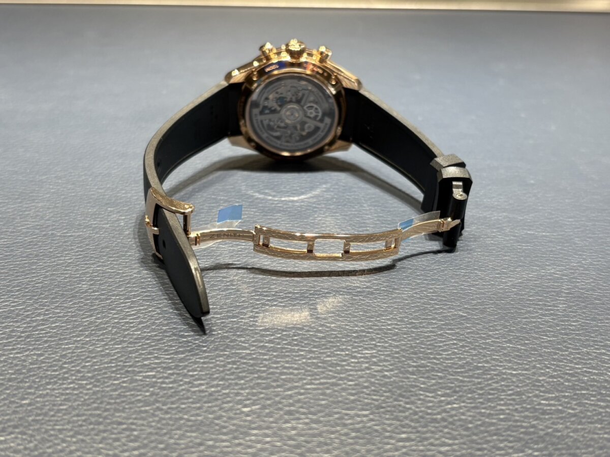 さらに、高級感を引き立てているのがバックル部分です。Dバックル仕様で、こちらにも18Kローズゴールドを贅沢に使用。