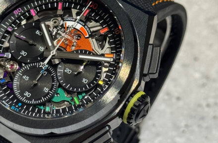 スケルトン仕様のダイアルからは1/100秒クロノグラフを搭載した秀逸なムーブメントを楽しめます。